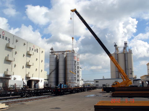 沢山の瓦礫で埋め尽くされた構内が片付き、レールの積込みが再開しました。 この日から3日間、作業員の方々が慎重にJR東日本様向けのレールを129本積み込みして、16日に再開第1便の発車が出来ました。
